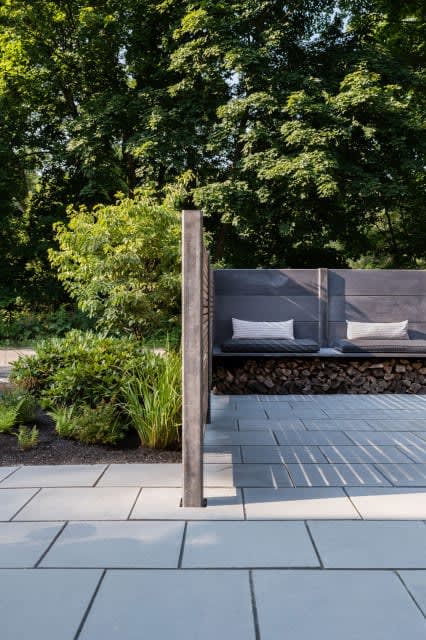 New bluestone pavers lead from the backyard to the side yard patio. The L-shaped screen features ipe slats and concrete posts. “The slats provide privacy but also allow some sunlight to filter through,” Daniels says.