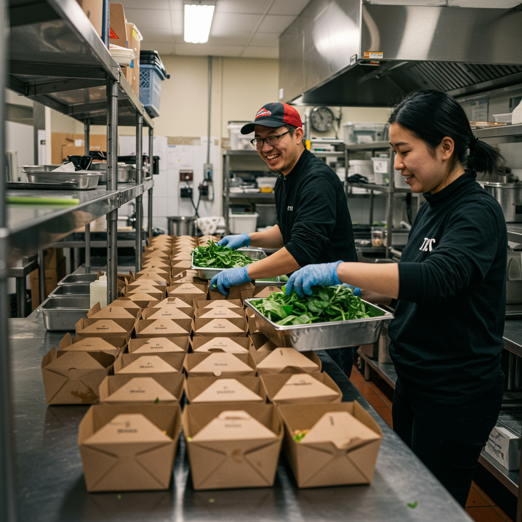 Ken Wan and Doris Yuen fill up salad boxes for Operation Family Meal. Photo by Thomas Garnick