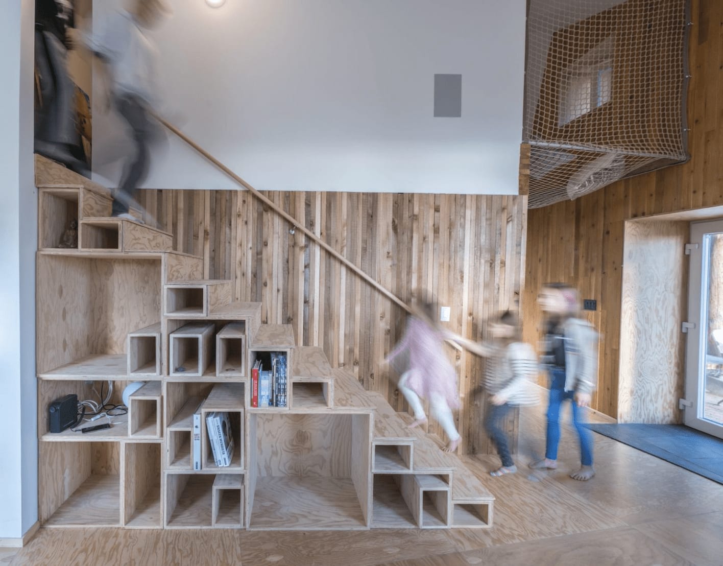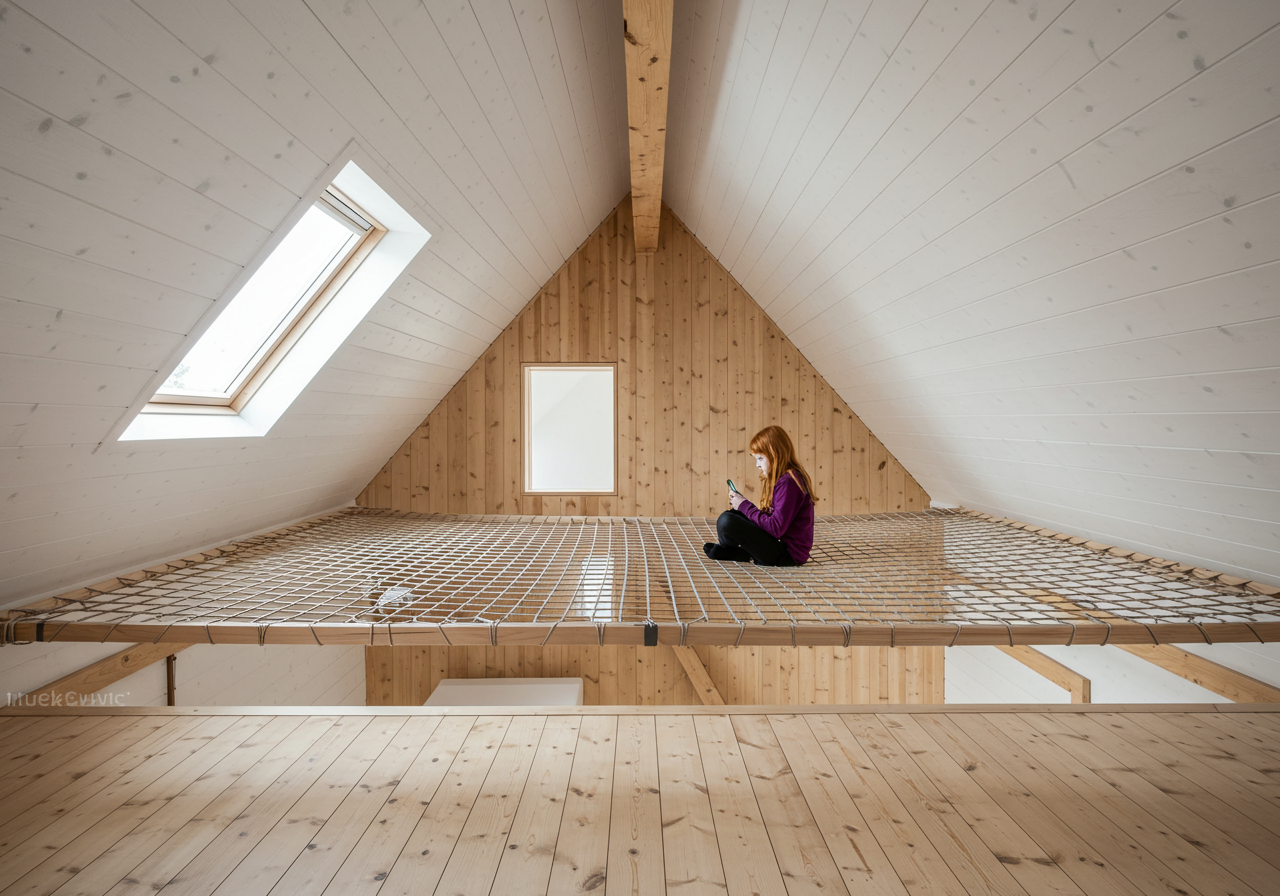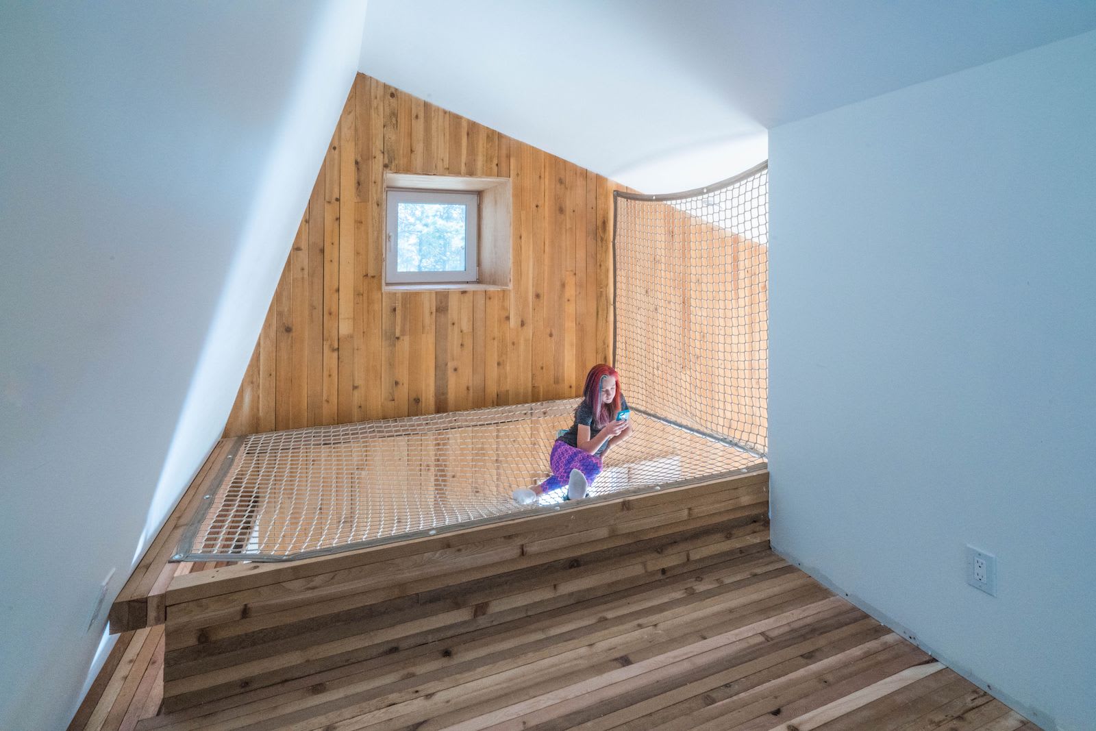 The most popular part of the house is the net (pictured above) at the very end of the loft space. It’s 10 feet off the ground. [Overlooking] the main living area, it serves a few functions: We needed to make that space feel less cave-like, and it brings daylight in. Acoustically, it connects the two living spaces as well. It’s just a lot of fun to do a surprise element in the house.