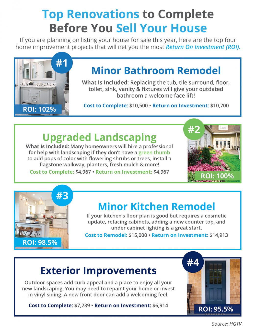 - If you are planning on listing your house for sale this year, here are the top four home improvement projects that will net you the most Return on Investment (ROI).