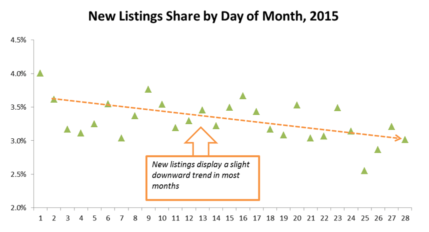 - While home closings exhibit a strong tendency to get done at the end of the month, listings are much steadier throughout the course of the month with a slight tendency to be posted earlier rather than later.