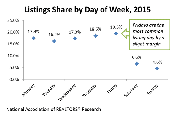 - While not devoid of new listings, the weekends are obviously not popular days to list. Among weekdays, Fridays and Thursdays are the most common days for new listings to go up, with Mondays and Wednesdays trailing a bit and Tuesdays not too far behind. Tuesdays and weekends are the only days of the week absent in the top 25 days for listings.