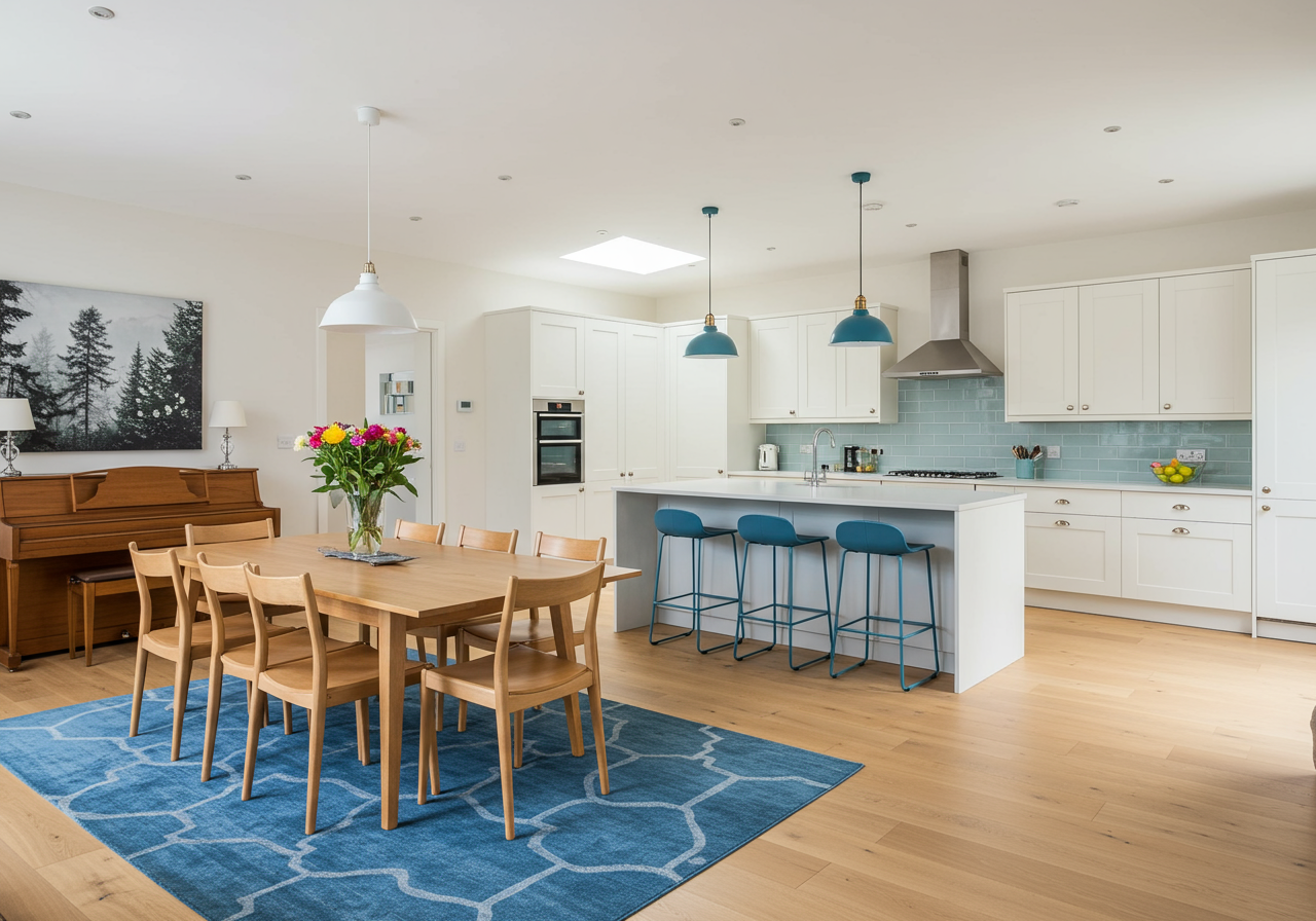 Blue can be used as a color pop but can also serve as a neutral shade. It can be used as a feature color in a bedroom when set against crisp white bedding and crown molding for a sharp contrast. In the living room, for a modern look, blue can be layered with tufted and velvet furniture or paired with metallic finishes, the paint firm suggests.