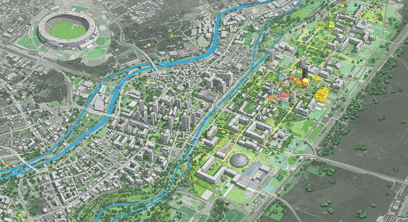 A rendering shows the River Mile project’s scope and proximity to the Pepsi Center and Empower Field at Mile High.